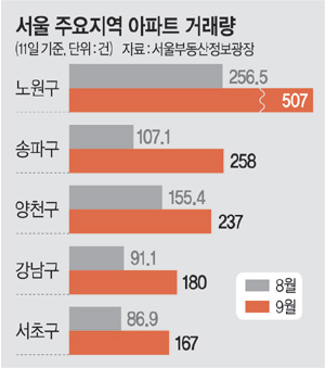 9월 거래량 증가는 성동구와 고가 아파트 밀집 지역에 집중돼 주목을 끌었다. 성동구는 11일 동안 177건이 거래되면서 이미 8월 전체거래량 172건을 넘어섰다. 성동구는 지난 3월 602건이 거래된 뒤 4∼8월 동안 평균 거래량이 150여 건에 그쳤다. 송파구는 258건이 거래되면서 8월 같은 기간(107.1건) 거래량을 훌쩍 넘어섰다. 강남구도 180건이 거래되면서 전월 같은 기간(91.1건)보다 배가량 많이 거래됐다. 또 서초구도 167건이 거래되면서 8월 동기 86.9건을 크게 추월했다. 강동구(182건) 등도 전월 같은 기간 대비 거래량이 급증했다. 이와 함께 양천구도 237건이나 거래되면서 전월 같은 기간(155.4건)을 이미 넘어섰다.