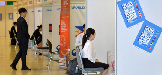 12일 서울 서대문구 홍은동 그랜드힐튼 서울호텔에서 열린 ‘2018 서울 국제트래블마트 관광산업 취업 페스티벌’을 찾은 구직자들이 취업 게시판을 살피고 있다.