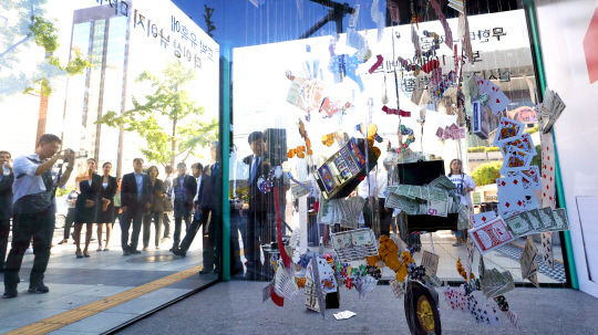 17일 서울 세종문화회관 앞에서 열린 ‘제10회 도박중독 추방의 날 기념식’ 참석자들이 착시 조형물을 살펴보고 있다.
