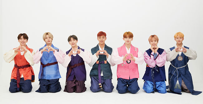 공개된 사진 속 몬스타엑스는 다채로운 색깔의 한복을 차려입고 일렬로 선 채 자연스럽게 미소를 지으며 두 손을 가지런히 모은 포즈를 취하고 있다.