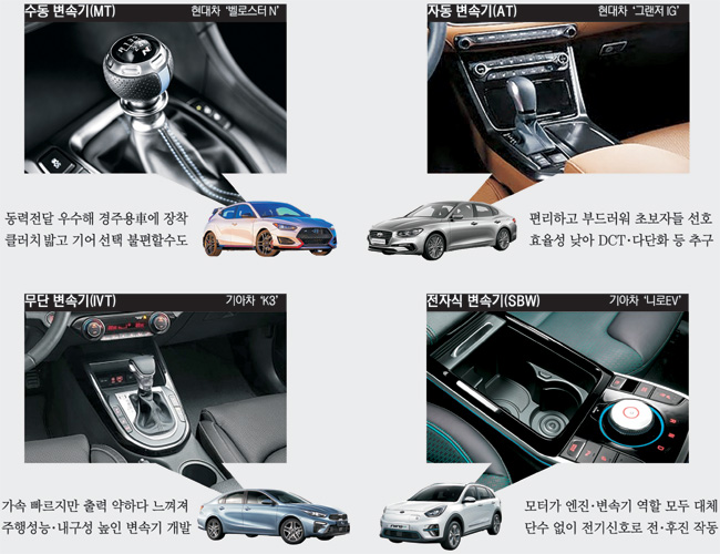 자동차의 동력성능을 좌우하는 핵심 부품은 엔진(전기차라면 모터)과 변속기다. 엔진의 성능이 좋을수록 적은 배기량으로도 높은 힘을 발휘해 엔진 회전 속도를 올릴 수 있다. 하지만 엔진을 무한정 빨리 돌릴 수 있는 건 아니다. 엔진 회전수의 한계 범위 내에서 힘과 연비가 균형을 이를 수 있도록 동력을 전달하는 게 변속기다. 변속기는 엔진이 연료와 산소를 태워 발생시킨 피스톤 운동에너지를 자동차의 속도에 따라 필요한 회전력으로 바꿔 바퀴에 전달하는 역할을 한다. 수동변속기(MT)에서 자동변속기(AT)로 넘어갔던 변속기는 지금도 계속 진화하고 있다. MT의 강점을 되살린 ‘자동화 수동변속기’가 나오고, 연료 효율성을 높이기 위해 무단(無段) 변속기를 장착한 차도 쏟아지고 있다. 최근에는 전기차 등에 쓰이는 전자식 변속기(SBW·Shift By Wire)도 등장했다.
