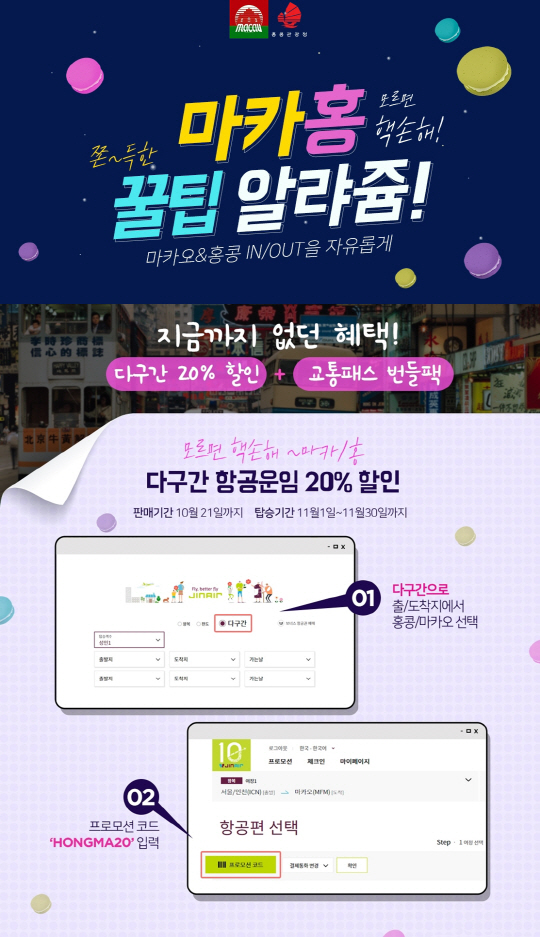 이번 이벤트는 다음 달 1일부터 30일 사이 운항하는 항공편을 대상으로 홍콩~마카오 다구간 여정 항공권을 예매한 고객에게 20% 할인 혜택을 제공한다. 할인 혜택 적용 방법은 진에어의 홈페이지 및 모바일 웹, 앱을 통해 홍콩∼마카오 다구간 여정 항공권 예매 시, 프로모션 코드 입력창에 ‘HONGMA20’을 입력하면 된다. 또한 진에어는 다구간 여정 항공권 예매 시 홍콩과 마카오를 편리하게 이동할 수 있는 코타이젯 페리 티켓을 정가 대비 할인된 가격인 1000원에 구매할 수 있는 서비스도 제공한다.