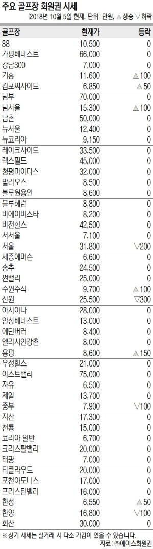 빚을 내서라도 한다는 가을 골프시즌이 본격적으로 시작됐다. 라운드 수요증가에 따른 문의가 증가하고 있으나 블루칩 위주의 서울 근교 종목에 집중되는 경향이 짙어 보인다. 종목별 차별화가 이어질 수 있는 여건이다. 초고가권은 전반적으로 매물 부족에 따른 강보합세가 우세한 가운데 남촌, 이스트밸리가 대표격인 양상이고 고가권은 우정힐스가 상승세이나 서울 근교의 신원과 서울이 하락으로 대비됐다. 중가권은 전반적인 강보합세를 보이면서 기흥, 남서울, 수원주식 등 다수가 상승반열에 올랐다.