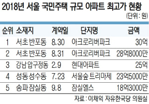 8일 국회 행정안전위원회 이채익(자유한국당) 의원이 서울시로부터 제출받은 ‘국민주택 규모 아파트 거래 현황’ 자료에 따르면, 전용 면적 84㎡인 반포동 아크로리버파크는 지난 8월 30억 원에 거래됐다. 재건축 아파트를 제외한 84㎡ 규모의 일반 아파트 가격이 30억 원을 돌파한 건 이번이 처음이다. 아크로리버파크 84㎡는 같은 달 28억8000만 원에도 거래됐다.