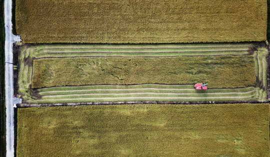 10일 경기 안성시 한 논에서 농민이 콤바인을 이용해 직사각형으로 돌며 벼 베기를 하고 있다.
