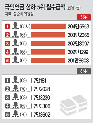 국민연금공단이 12일 국회 보건복지위원회 김승희(자유한국당) 의원에게 제출한 ‘국민연금 최대금액 상위 100명과 하위 100명 상세자료(7월 기준)’에 따르면 서울 강남구에 거주하는 65세 남성 이모 씨의 월 연금수급액이 204만5553원으로 가장 많았다.