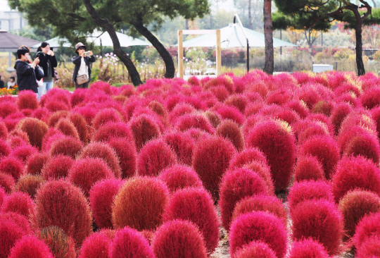 22일 경기 시흥시 장곡동 갯골생태공원을 찾은 시민들이 붉게 물든 댑싸리를 휴대전화 카메라에 담으며 가을 정취를 만끽하고 있다.