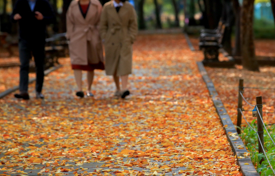 서울 지역에 비가 내린 23일 동작구 보라매공원에서 시민들이 비가 그친 뒤 낙엽이 덮인 공원 산책로를 걷고 있다.