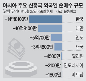 30일 블룸버그에 따르면, 국내 증시의 외국인 매도세는 아시아 주요 7개 신흥국 중 가장 가파른 수준이다. 국내 증시에서 지난 한 주(22∼26일) 동안 외국인은 총 14억8100만 달러를 순매도했다. 같은 기간 대만에서는 10억8100만 달러, 인도에서는 5억700만 달러, 태국에서는 3억4800만 달러 등 순매도에 그쳤다. 아시아 주요 신흥국 7개국 중 가장 대규모의 순매도세가 나타난 것이다. 월간 기준으로 보면 10월 들어서만 39억6000만 달러 순매도가 이뤄졌다. 대만(52억6300만 달러)을 제외하면 가장 규모가 크다.