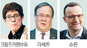 29일 도이체벨레, 베스트도이체차이퉁 등 독일 현지언론에 따르면 메르켈 총리의 뒤를 이을 CDU의 차기 당권주자로 아네그레트 크람프카렌바워(56) CDU 사무총장과 옌스 슈판(38) 보건장관, 아르민 라셰트(57) 노르트라인베스트팔렌주 총리 등이 거론되고 있다. 크람프카렌바워 사무총장은 세간에 ‘미니 메르켈’로 알려져 있을 정도로 메르켈 총리의 신임이 두텁다. 메르켈 총리는 차기 당 대표 선출에 특정 후보를 지지하지 않겠다고 공언했지만, 독일 RTE는 “메르켈은 크람프카렌바워 사무총장이 후임 당 대표를 맡기를 희망한다”고 보도했다. 메르켈처럼 당내 중도노선을 견지하고 있으며 2011년부터 자를란트주 장관을 맡았고 현재 사회민주당(SPD)과 대연정을 성사시키는 데도 큰 역할을 했다. 올해 99%의 압도적 지지를 받아 당 사무총장으로 발탁됐다.