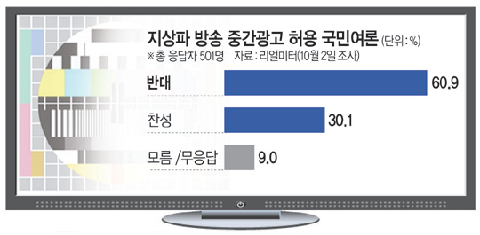 방통위는 지난 9일 정부과천청사에서 방송광고 제도개선에 대한 정책 방향을 발표하며 “동일서비스 동일규제 원칙에 따라 매체 간 형평성 제고를 위해 지상파 방송에도 중간광고 도입을 추진할 계획”이라고 밝혔다. 그러나 시청자들은 시청권 침해를 이유로 중간광고 도입을 반대하고 있다. 리얼미터가 최근 지상파 중간광고 허용과 관련해 실시한 국민 여론 조사에 따르면 도입 반대 의견이 60.9%로 찬성(30.1%)의 두 배 이상으로 나왔다. 또 한국신문협회가 지난해 실시한 조사 연구 결과에서도 지상파 중간광고 도입 필요성에 대해 ‘(전혀+별로) 필요하지 않다’는 응답이 57.1%로 ‘(매우+어느 정도) 필요하다’(17.8%)는 응답의 3배를 넘었다.