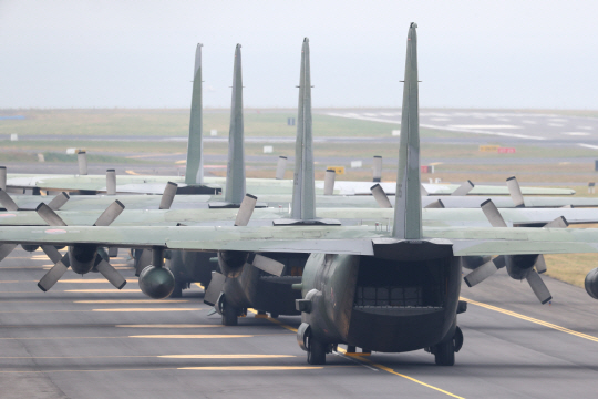 공군의 C-130 수송기들이 지난 9월 평양 남북정상회담 당시 북한으로부터 받은 송이버섯 2t에 대한 답례품인 제주산 감귤을 실은 채 11일 제주국제공항에서 이륙을 준비하고 있다. 청와대는 12일까지 4차례에 걸쳐 총 200t의 감귤을 북한에 보낼 예정이다.