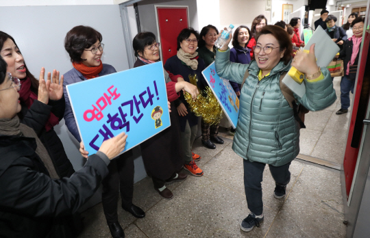 2019 대학수학능력시험을 사흘 앞둔 12일 2년제 학력인정 평생학교 일성여중고에서 후배들이 수능 합격기원 팻말을 들고 고3 선배들을 응원하고 있다.