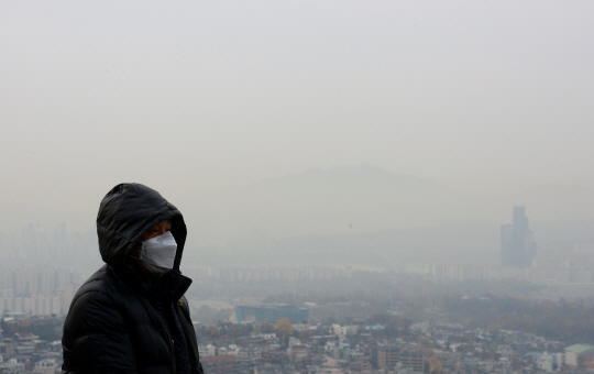 16일 오전 서울 용산구 남산서울타워에서 한 관광객이 마스크를 쓰고 뿌연 시내를 바라보고 있다. 이날 대기정체로 축적된 국내 미세먼지에 중국 스모그 유입이 더해지면서 수도권과 강원 영서, 충청, 전북, 경북은 초미세먼지(PM2.5) 농도가 ‘나쁨’(35㎍/㎥ 초과) 상태를 보였다.