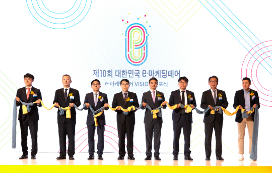 행정안전부와 전자상거래기업 이베이코리아가 주최하는 ‘제10회 대한민국 e-마케팅페어’ 시상식이 15일 서울 강남구 역삼동 GS타워에서 개최됐다. 변광윤(왼쪽 다섯 번째) 이베이코리아 대표이사 등 관계자들이 행사장에서 비전 선포식을 진행하고 있다.