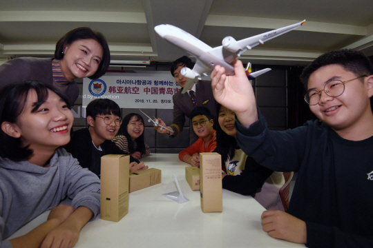 아시아나항공 주최로 20일 중국 칭다오 청운한국학교에서 열린 청소년 진로특강 ‘제6차 해외 색동나래교실’에서 아시아나항공 승무원들이 직업소개와 진로교육을 하고 있다. 해외 색동나래교실은 기존에 국내 청소년을 대상으로 실시해 온 직업교육 색동나래교실을 2017년 중국 상하이를 시작으로 해외로 영역을 확장한 것이다.