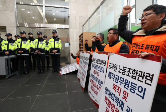 공무원노조 조합원들이 21일 오전 세종시 인사혁신처 로비에서 해직 공무원의 원직 복직 약속 이행을 촉구하며 농성을 벌이고 있다.