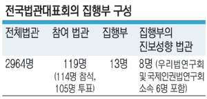 사법행정권 남용 의혹 연루 현직 판사들에 대한 탄핵소추를 촉구한 전국법관대표회의 집행부의 절반 이상이 진보 성향의 법관 모임인 우리법연구회 및 국제인권법연구회 출신이거나 공개적으로 진보성향을 드러낸 판사인 것으로 나타났다. ‘사법부 코드화’ 우려 속에 대법원장 자문 기구 역할을 하는 법관대표회의까지 특정 정치색을 띠는 집행부가 주도하면서 정치적으로 편향된 결정을 내릴 수 있다는 지적이 나오고 있다.