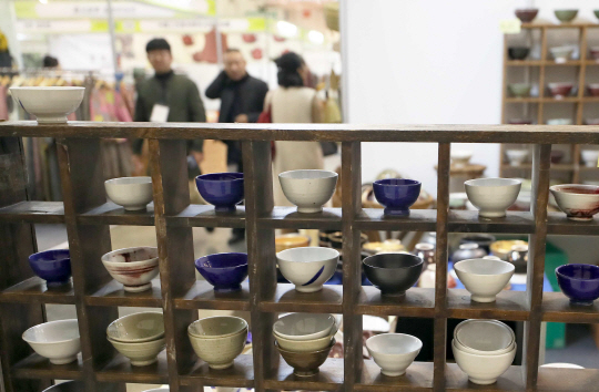 22일 부산 해운대구 벡스코에서 열린 ‘2018 국제 차·공예 박람회’에서 관람객이 다양한 다기(茶器)를 살펴보고 있다.