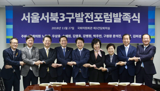 서울 마포·서대문·은평구 등 서북지역 3개구 국회의원과 구청장이 27일 국회 의원회관에서 ‘서울 서북3구 발전 포럼 발족식’(사진)을 열고 지역발전을 위해 함께 노력하기로 했다. 이 자리에는 노웅래·손혜원(마포구), 우상호·김영호(서대문구), 박주민·강병원(은평구) 등 3개 지역구 국회의원과 유동균 마포구청장, 문석진 서대문구청장, 김미경 은평구청장 등이 참석했다.