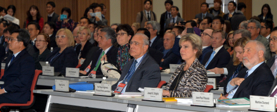 27일 인천 연수구 송도컨벤시아에서 열린 ‘제6차 경제협력개발기구(OECD) 세계포럼’에서 앙헬 구리아(앞줄 왼쪽부터) OECD 사무총장, 페트라 라우렌틴 네덜란드 왕자빈, 조지프 스티글리츠 컬럼비아대 교수 등 내빈들이 김동연 부총리 겸 기획재정부 장관의 인사말을 듣고 있다.