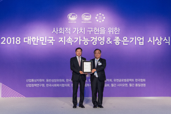 에몬스(회장 김경수, 사장 조성제·사진 왼쪽)는 한국표준협회(KSA·회장 이상진·〃오른쪽)가 주관하는 ‘2018 대한민국 좋은기업(Korean Good Company)’ 에서 생활가구 부문 1위를 수상했다고 28일 밝혔다.