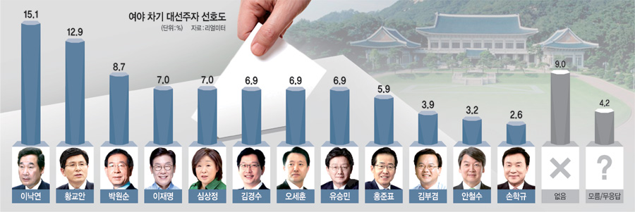 리얼미터가 오마이뉴스 의뢰로 지난 26∼30일 전국 성인남녀 2513명을 대상으로 실시한 설문조사 결과(95% 신뢰수준에 표본오차 ±2.0%포인트)에 따르면 이낙연 국무총리가 15.1%로 1위에 올랐고, 황교안 전 국무총리는 12.9%로 이 총리에게 오차범위 내에서 뒤진 2위를 기록했다. 박원순 서울시장(8.7%)이 3위, 이재명 경기지사(7.0%)와 심상정 정의당 의원(7.0%)이 공동 4위에 올랐다. 김경수 경남지사(6.9%)와 오세훈 전 서울시장(6.9%), 유승민 전 바른미래당 대표(6.9%)가 공동 6위였고, 홍준표 전 자유한국당 대표(5.9%)가 9위를 기록했다. 이어 김부겸 행정안전부 장관(3.7%), 안철수 바른미래당 인재영입위원장(3.2%), 손학규 바른미래당 대표(2.6%) 순이었다. ‘없음’은 9.0%, ‘모름/무응답’은 4.2%다.