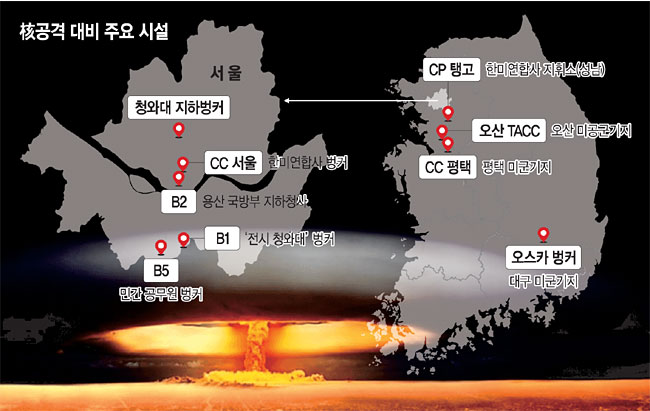 한·미 연합군은 북한의 핵 공격에 대비한 ‘핵 벙커’를 갖추고 있다. 유사시 한국 지도부는 일단 청와대 지하벙커와 용산 국방부 B2에서 지휘하다가, 사태가 심각해지면 대통령 등 전쟁지도부는 B1으로 이동하고, 일반 주요 공무원은 관악산 벙커 B5에 대피하게 돼 있다. B5는 과천정부청사·벙커 B1과 지하로 연결돼 있다고 한다. B1에서 을지프리덤가디언(UFG) 연습을 지휘하며, 지난해 한·미 연합 지휘소연습(CPX) 키리졸브 훈련도 이곳에서 진행됐다.