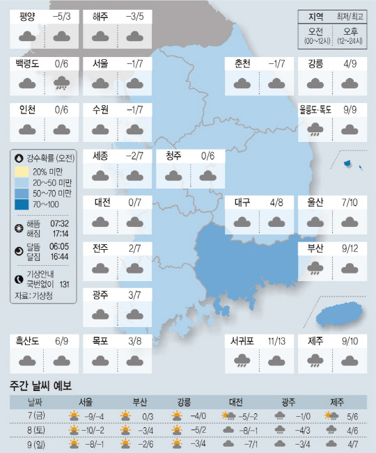 전국이 대체로 흐리고 제주와 남해안은 오전까지 가끔 비가 오겠다. 아침 최저기온은 영하 5도에서 영상 9도, 낮 최고기온은 5도에서 12도가 되겠다.