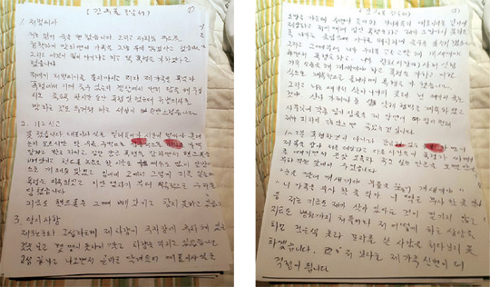김 상무의 진술서(사진)에 따르면 폭행 당시 느꼈던 공포감과 울분, 억울함 등이 생생하게 적혔다. “저는 맞아 죽을 뻔했습니다”라는 말로 시작되는 진술서에서 김 상무는 “발, 무릎, 주먹으로 머리 등을 가격당했다. 입과 코에서 그렇게 피를 쏟는데도 폭행은 계속됐다. 그때 뺏긴 휴대전화는 지금도 찾지 못하고 있다”고 썼다. 이어 “너는 여기서 살아나가지 못해, 넌 여기서 죽는 거야, 시너 가져와 등의 살해 협박을 계속 받았다. 사무실 집기를 제 안면에 집어 던져 피하지 않았다면 죽었을 것이다”라고 생명의 위협을 느꼈던 당시 상황을 전했다. 이어 “감금돼 있는 동안 뺨을 때리면서 온갖 모욕과 죽고 싶을 만큼의 모멸감을 부하직원 앞에서 줬다. ‘눈 깔아 이 ××야’ ‘네 딸은 무사할 줄 알아?’ 등의 말을 들었다. 지금도 검은색 옷과 모자를 쓴 사람을 쳐다보지 못하겠다”고 밝혔다. 이어 “핏자국을 지운다고 물청소를 하고 피 묻은 종이와 천을 모두 수거해 가는 모습이 정말 우발적인 행동인가요”라고 반문하기도 했다.