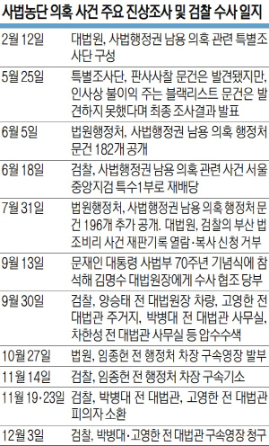 ◇영장 기각한 판사들은 = 법원의 두 전직 대법관 구속영장 기각에 따른 공정성 논란이 불거질 가능성은 크지 않다는 분석이 나온다. 구속영장을 기각한 임 부장판사와 명재권 부장판사는 대법원이나 법원행정처 등에서 근무한 경력이 없다. 더욱이 임 부장판사는 10월 임 전 차장의 구속영장을 발부하기도 했다. 사법행정권 남용 의혹에 연루된 핵심 인물 중 첫 구속이었다. 검사 출신인 명 부장판사는 지난 9월 고 전 대법관의 자택과 박 전 대법관의 자택 등지에 대한 압수수색 영장을 발부하기도 했다. 두 판사는 사법행정권 남용 의혹 수사가 시작된 후 재판부에 합류했다.