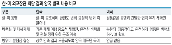 반면 국무부는 이날 헤더 나워트 대변인 명의 보도자료에서 “두 장관이 한·미의 철통같은 동맹을 재확인하고 북한의 FFVD를 확보하기 위해 긴밀한 협력을 유지하기로 했다”고 밝혔다. 한국이 ‘완전한 비핵화’, 미국은 FFVD에 방점을 뒀던 기존 표현을 그대로 사용한 것으로, 양측이 이번 회담에서도 크게 입장을 좁히지는 못한 것으로 보인다. 다만, 외교부는 “기존 (대북) 제재 이행의 중요성을 재확인했다”면서 미국 측 입장을 다소 반영했다. 또 외교부가 “현재 진행 중인 한·미 방위비 분담금 협의와 관련해서도 상호 만족할 만한 결과가 도출될 수 있도록 양국 대표단을 계속 독려해 나가기로 했다”고 밝힌 것도 이례적으로 평가된다. 그만큼 한·미 방위비 분담금 협의가 원활하지 않다는 방증이라는 해석이 나온다. 한·미 양국은 이날 국장급 인사들이 참석한 워킹그룹 화상회의에서도 “진전된 남북, 미·북 관계 동향을 공유하고 남북협력 등 북핵·북한 관련 제반 현안에 대해 종합적으로 논의했다”고 외교부는 밝혔다.