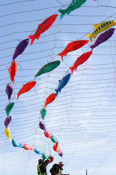 2019 화천 산천어축제 개막을 한 달 앞둔 6일 강원 화천군 화천읍 중앙로에서 축제 관계자들이 산천어 모양으로 만든 등을 설치하고 있다.