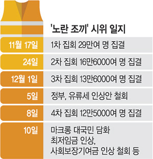 1차 시위에만 29만여 명이 모였고 2차 집회 16만6000여 명, 3차 집회 13만6000여 명이 각각 집결했다. 참여 인원은 줄었지만 시위 양상이 폭력적으로 변하며 4명이 숨지고 부상자도 급증했다. 지난 5일 정부가 유류세 인상안을 철회했지만 8일 4차 집회에는 12만5000여 명이 대입제도 개편, 부유세 폐지 철회 등을 주장하며 마크롱 정부 퇴진까지 요구하고 나섰다. 이날 시위에서는 경찰관 17명을 포함한 135명이 다쳤고 1000여 명이 체포됐다.