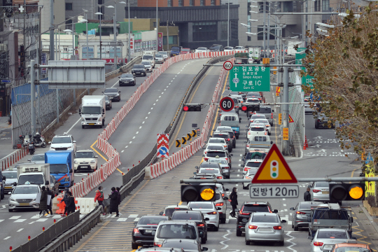 서울 구로구 가리봉동의 41년 된 구로고가차도 철거 공사가 시작된 11일 줄어든 고가도로로 차량이 몰리면서 정체 현상이 빚어지고 있다.