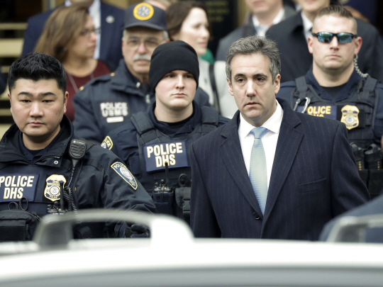도널드 트럼프 미국 대통령의 개인변호사였던 마이클 코언이 12일 미국 뉴욕의 뉴욕연방지방법원에서 징역 3년을 선고받은 후 재판정을 나서고 있다. 2016년 대선 당시 트럼프 후보와 성관계를 가졌다고 주장한 여성 2명에게 합의금을 주고 의회에서 위증한 혐의로 재판에 넘겨진 그는 선고 전 최후진술에서 “그(트럼프)의 더러운 행동을 덮어주는 것이 내 의무라고 느꼈다”고 밝혔다.