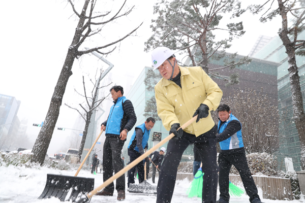 13일 오전 서울 곳곳에 눈이 내린 가운데 박준희(가운데) 관악구청장이 직원들과 함께 넉가래로 청룡동 일대 도로에 쌓인 눈을 치우고 있다. 노기섭 기자 mac4g@munhwa.com