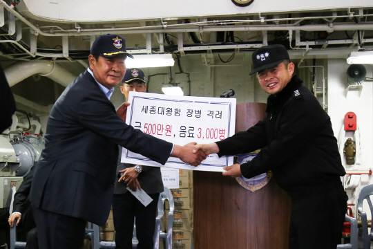 광동제약은 최근 자매부대인 세종대왕함을 찾아 김현식(사진 왼쪽) 광동제약 사장과 이구성 세종대왕 함장(대령) 등이 참석한 가운데 해군 장병들을 격려하고 위문품 등을 전달했다고 18일 밝혔다.