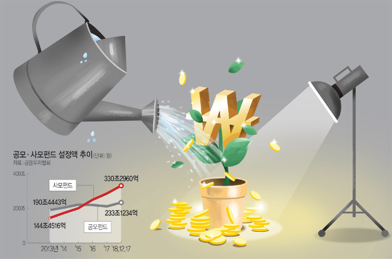 ◇사모펀드가 대세 = 공모펀드의 증가율이 주춤한 것과 달리 사모펀드 설정액은 올해 들어서만도 44조 원 이상 증가하는 등 빠르게 덩치를 키우고 있다. 20일 금융투자협회에 따르면 지난 17일 기준으로 사모펀드 설정액은 330조2960억 원으로 전년 말 대비 44조3234억 원(15.5%)이 늘었다. 이는 같은 시기를 기준으로 한 공모펀드 설정액인 233조1234억 원보다 42%나 많은 액수다. 사모펀드 설정액은 지난 2015년 말 200조4307억 원으로 공모펀드 221조2898억 원보다 적었으나 2016년 말 사모펀드가 249조6531억 원으로 전년 대비 25% 늘면서 219조6120억 원에 그친 공모펀드를 추월한 이후 사모펀드와 공모펀드의 설정액 격차는 점차 벌어지고 있다.