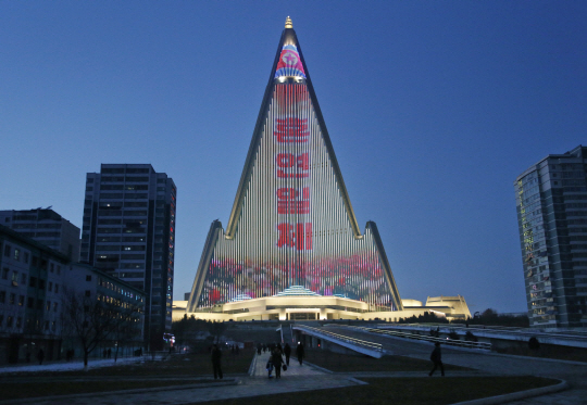 북한 정책 실패의 상징인 류경호텔이 전력난에도 불구하고 밤마다 10만 개 이상의 LED 조명쇼(사진)를 벌이고 있다.