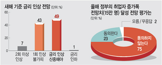 국내 경제 전문가들은 한국은행이 올해 기준금리 인상에 신중해야 한다는 의견을 밝혔다. 또 대다수 경제 전문가는 올해 정부가 예상한 취업자 증가 폭 15만 명 달성은 어려울 것으로 평가했다.
