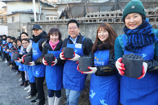정지선(오른쪽 세 번째) 현대백화점그룹 회장과 임직원 및 고객봉사단 200여 명은 2일 새해 첫 업무를 서울 노원구 중계본동 백사마을을 찾아 연탄 나눔 봉사활동으로 시작했다. 연탄은행에도 25만 장의 연탄을 기증했다.