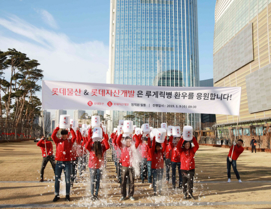 이광영(앞줄 가운데) 롯데자산개발·롯데물산 대표이사와 임직원들이 9일 서울 송파구 잠실동 롯데월드몰 야외 잔디공원에서 열린 루게릭병(근위축성 측삭경화증) 환우를 응원하기 위한 ‘아이스버킷 챌린지’에서 얼음물을 뒤집어쓰고 있다. 올해 아이스버킷 챌린지 첫 주자로 나선 이 대표는 다음 주자로 문영표 롯데마트 대표이사를 지목했다.