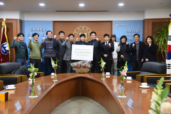 인하대는 지난 2017년에 재직 30주년을 맞은 이승걸(오른쪽 일곱 번째) 정보통신공학과 교수의 제자 15명이 학교발전기금으로 1340만 원을 모아 지난 10일 이 교수와 제자, 조명우(〃여섯 번째) 총장 등 10여 명이 함께 한 자리에서 전달했다고 14일 밝혔다.