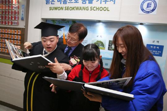 17일 오전 장애인 특수학교인 경기 수원 서광학교 졸업식에서 만난 안도훈(가명·18·사진 왼쪽) 군은 선물로 받은 졸업 앨범에 얼굴을 파묻고 있었다. 안 군은 활짝 웃으며 졸업 앨범 속 자신과 친구들의 얼굴을 하나씩 찾아 나갔다. 누군가를 찾을 때마다 안 군은 “나 최고, 친구 예뻐” 등의 말로 한껏 기쁨을 표현했다. 장애로 인해 초등학교 1학년 수준의 지능을 지닌 안 군은 앨범을 제작해 준 삼성SDI 직원들에게 “고.맙.습.니.다”라고 한 자 한 자 마음을 눌러 담아 감사의 인사를 전했다.