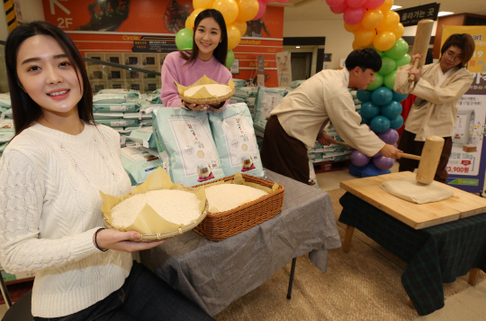 17일 서울 성동구 이마트 성수점에서 모델들이 특가 판매하는 쌀을 홍보하고 있다. 이마트는 이날부터 1주일간 성수점에서만 의성진쌀 10㎏을 8000원 할인된 2만3900원에 판매한다.