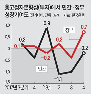 실제 4분기 GDP에 대한 정부의 성장기여도는 1.2%포인트였다. 2009년 1분기 이후 최대치였다. 반면, 민간의 성장기여도는 -0.3%에 불과했다. 총고정자본형성(투자)에서 정부의 성장기여도는 지난해 3분기 -0.4%포인트에서 0.7%포인트로 대폭 증가했으며, 민간은 3분기 연속 마이너스에 그쳤다.