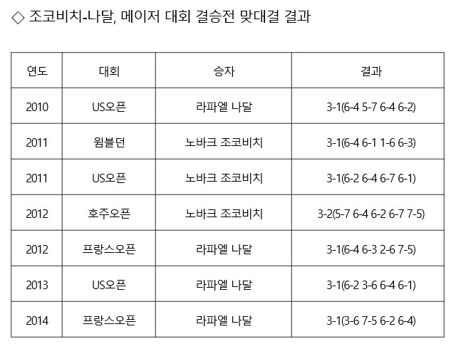 조코비치와 나달의 이번 대회 남자단식 결승은 27일 한국 시간으로 오후 5시 30분 같은 장소에서 시작한다.