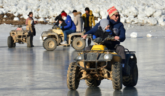 제19회 인제빙어축제 개막일인 26일 관광객들이 강원 인제군 소양호 빙판 위에서 사륜 오토바이를 타며 즐거워하고 있다.