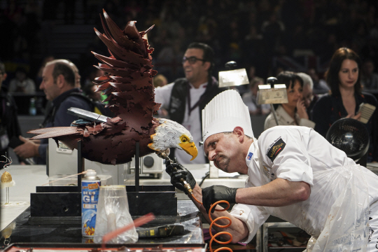28일 프랑스 리옹에서 열린 ‘세계 패스트리컵’ 대회에 호주 대표로 참가한 한 제과 전문가가 활짝 나는 독수리 모양의 디저트를 만들고 있다.